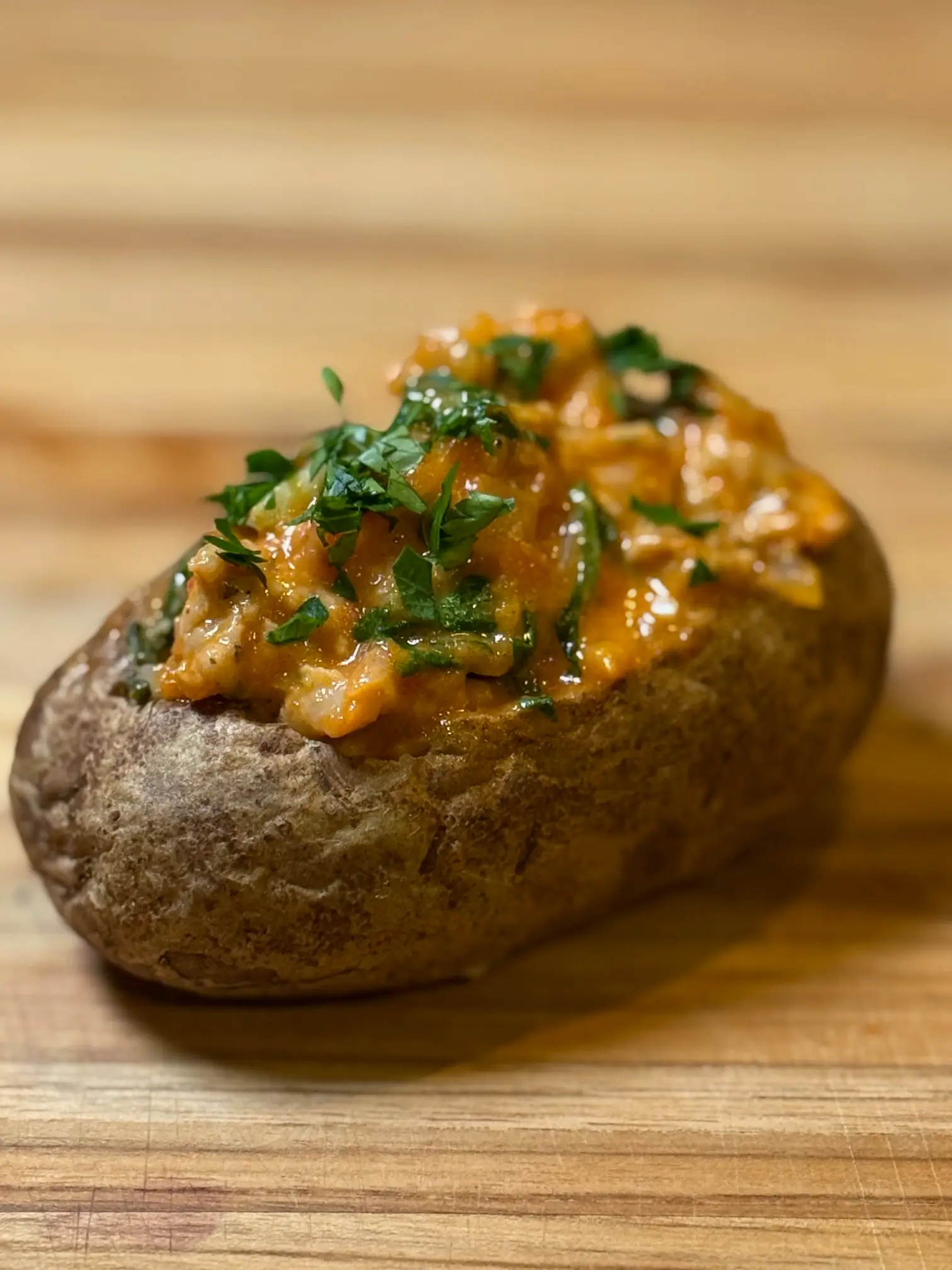 Cut a slit in the top of each baked potato and gently squeeze the ends to form an opening in the top. Spoon the sausage sauce into each potato. Garnish with parsley.