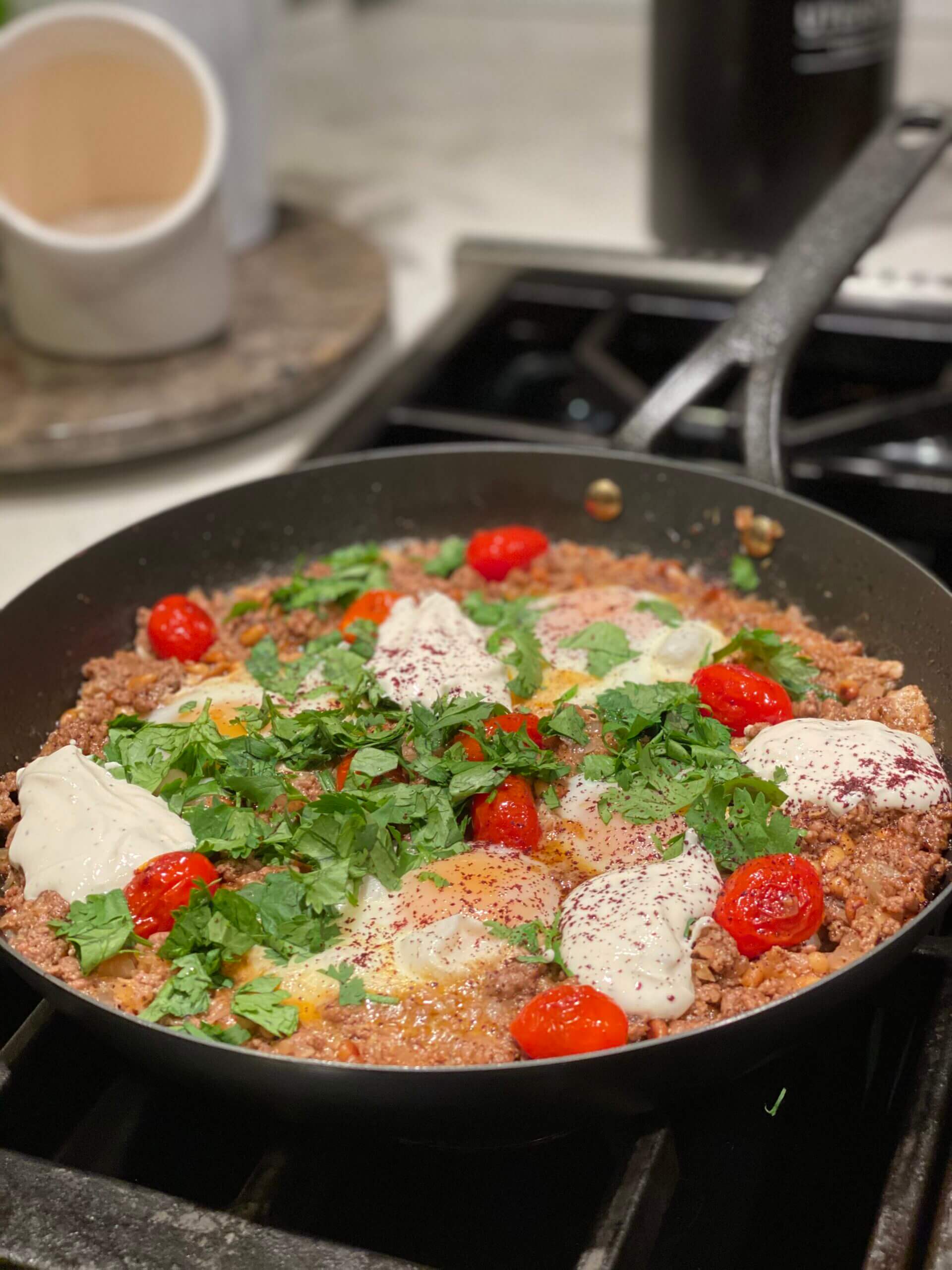 Remove from the heat and dot with dollops of the yogurt sauce, sprinkle with sumac, and finish with cilantro.