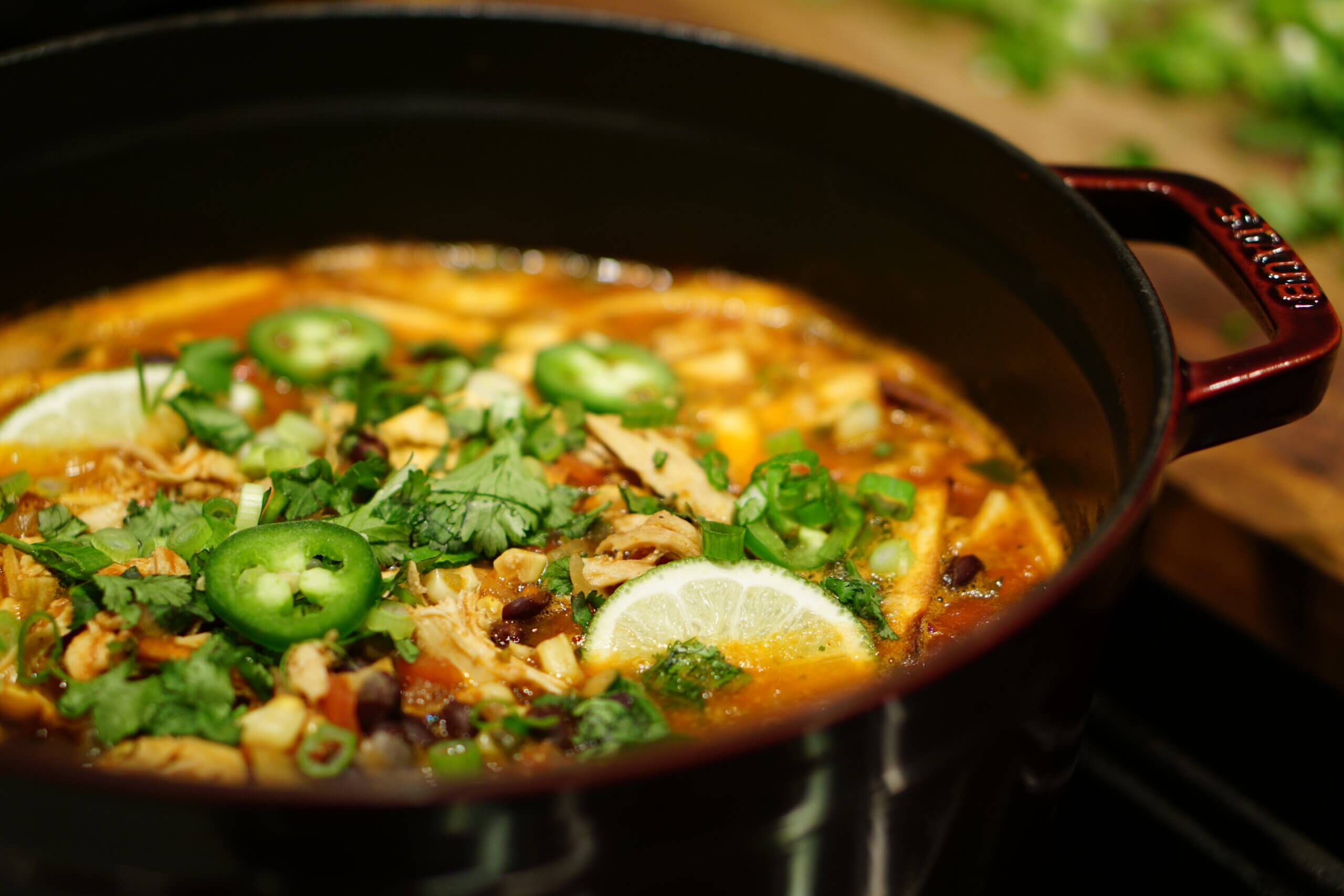Serve the soup with some tortilla strips, pieces of avocado, fresh cilantro and lime wedges.