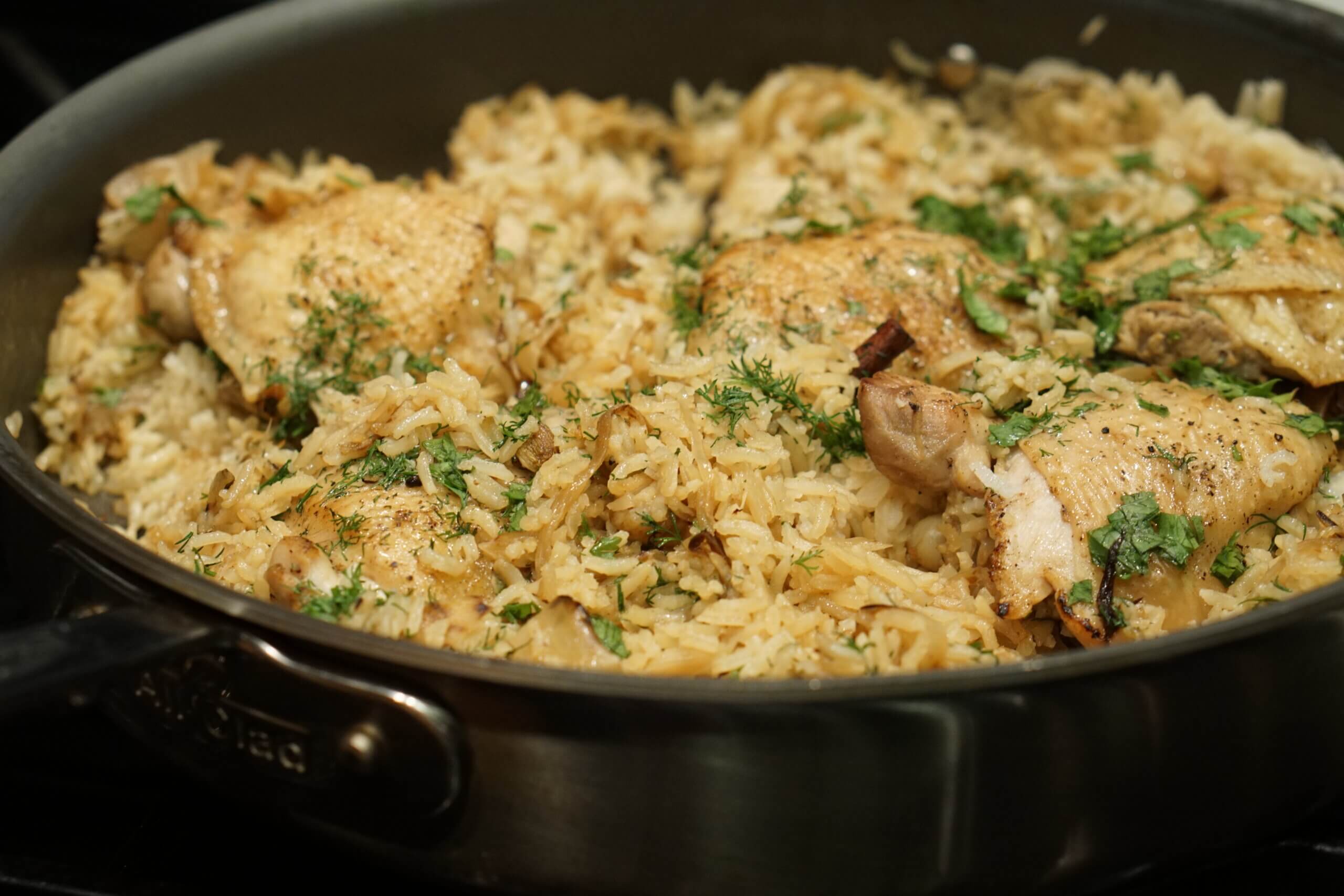 Place the chicken in a large mixing bowl and season with 1½ teaspoons each salt and black pepper. Add the remaining olive oil, cardamom, cloves and cinnamon and use your hands to mix everything together well. Heat the frying pan again and place the chicken and spices in it. Sear chicken for 5 minutes on each side and remove from the pan (this is important as it part-cooks the chicken). The spices can stay in the pan, but don’t worry if they stick to the chicken. Remove most of the remaining oil as well, leaving just a thin film at the bottom. Add the rice, caramelized onion, 1 teaspoon salt and plenty of black pepper. Drain the barberries and add them as well. Stir well and return the seared chicken to the pan, pushing it into the rice.