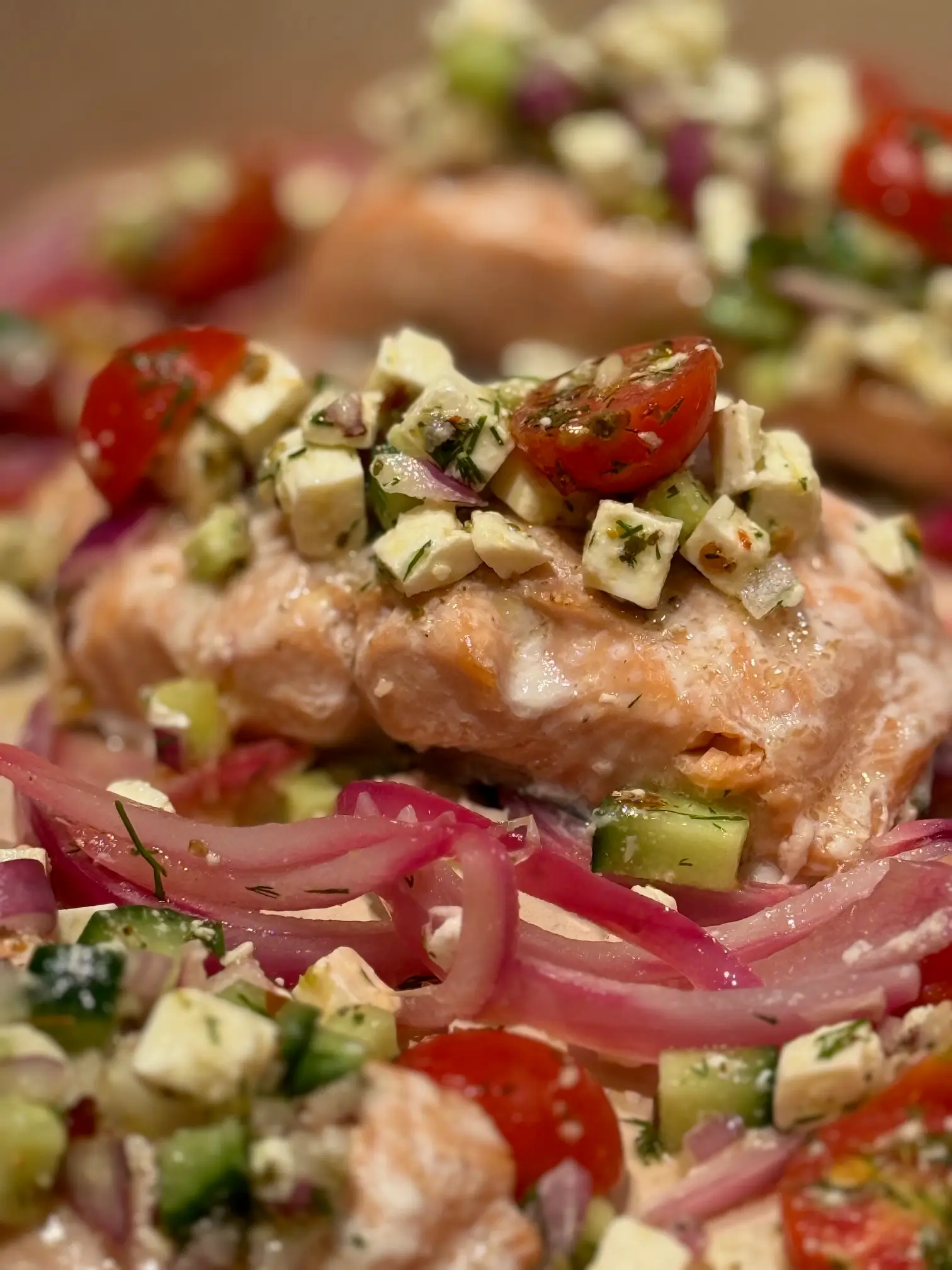 To serve: Plate salmon with lemon and red onion slices and top with feta mixture.