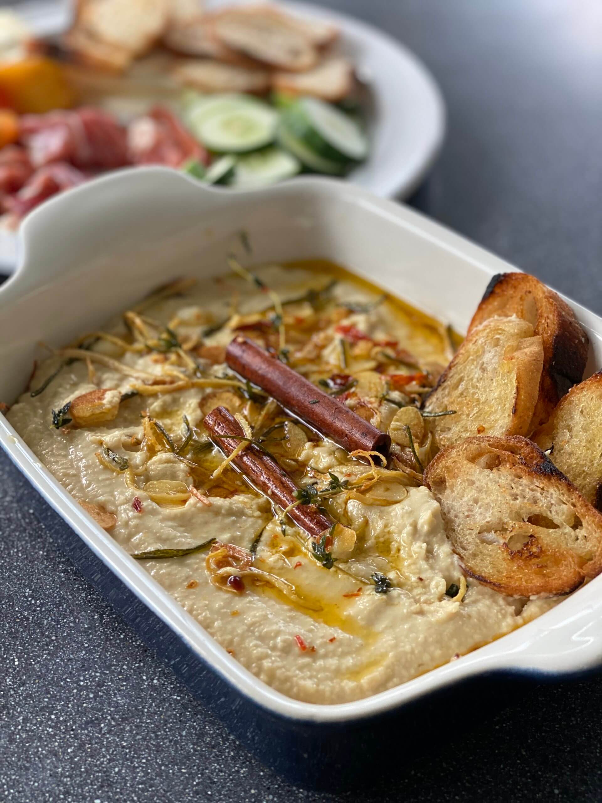 Spoon the hummus on to a large plate, creating a large well in the centre with the back of a spoon. Spoon the oil into the well and drizzle over the remaining tablespoon of lemon juice. Top with the fried aromatics and fresh coriander, and serve.