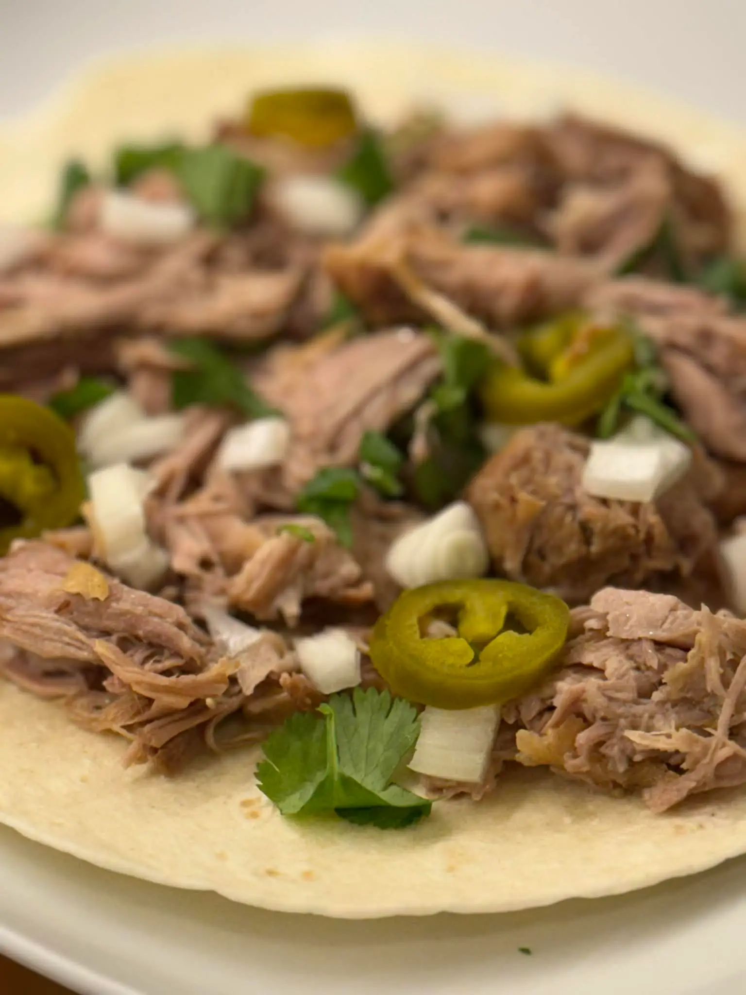 Transfer the pork to a clean cutting board and shred with 2 forks or your fingers. Serve the pork on warm 6-inch corn tortillas with more pickled jalapeños, diced white onion, and chopped fresh cilantro.