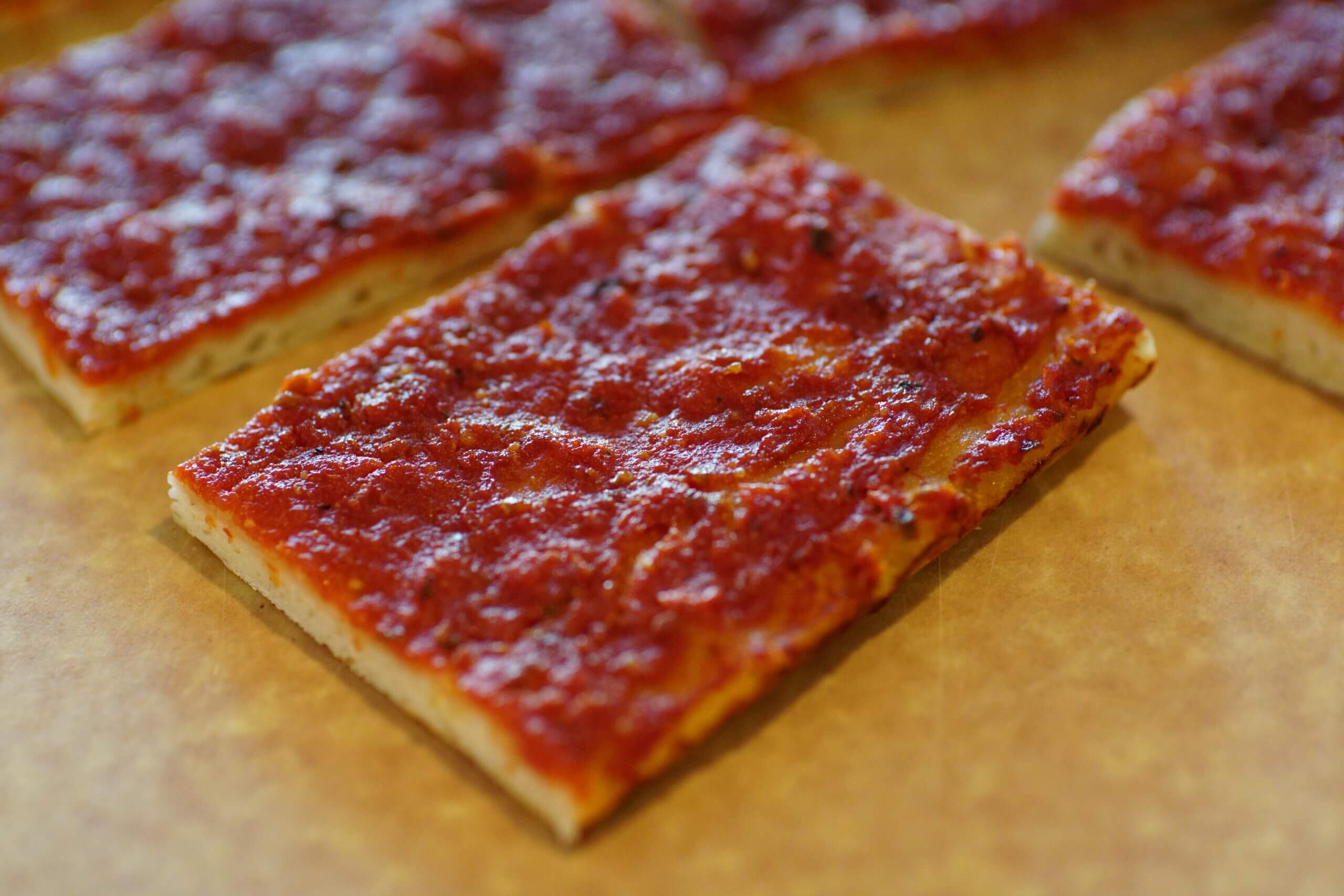 Also called, ‘Bakery pizza’ these little rectangular slices of focaccia-style bread topped with tomato sauce are sold in nearly every bakery across Rhode Island.