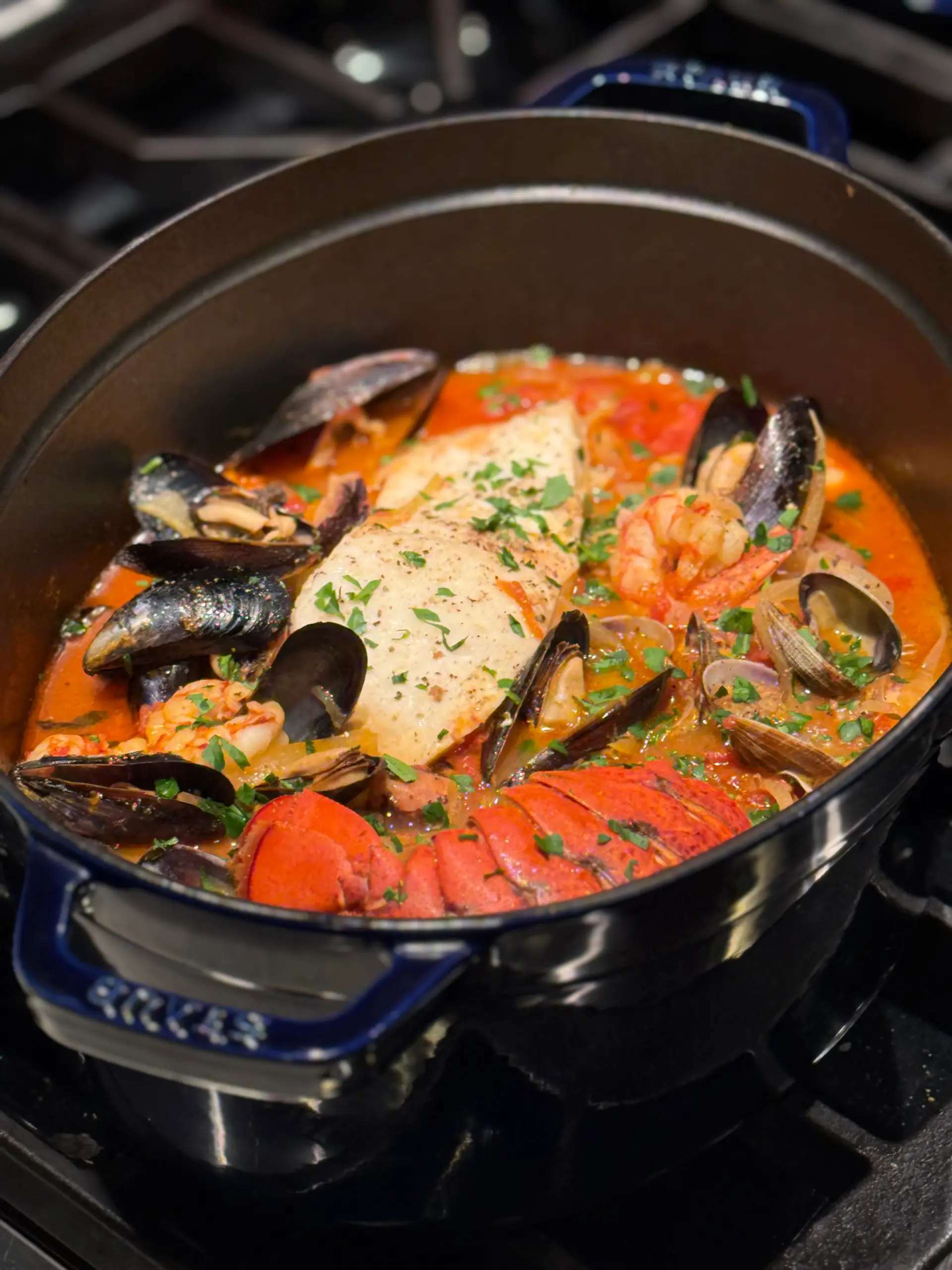 The order of adding the seafood to the pot is important so that it all cooks perfectly.