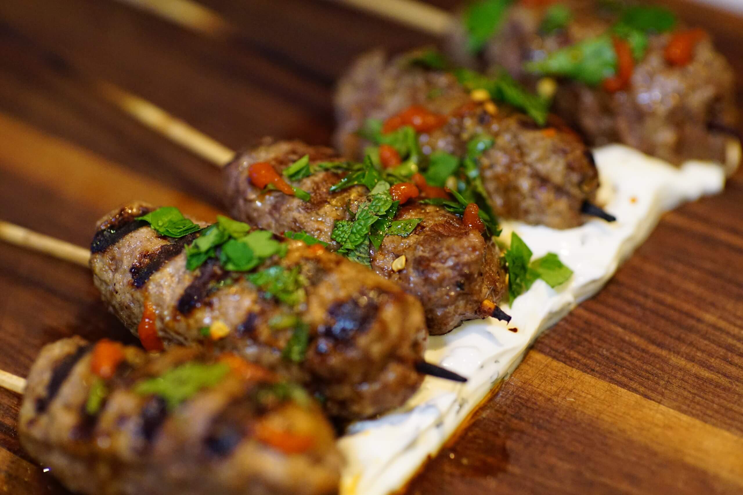 To serve, schmear a thick strip of mint yogurt sauce down one side of a platter. Put the meat end of each skewer in the yogurt. Drizzle with the chile sauce, and garnish with the mint.
