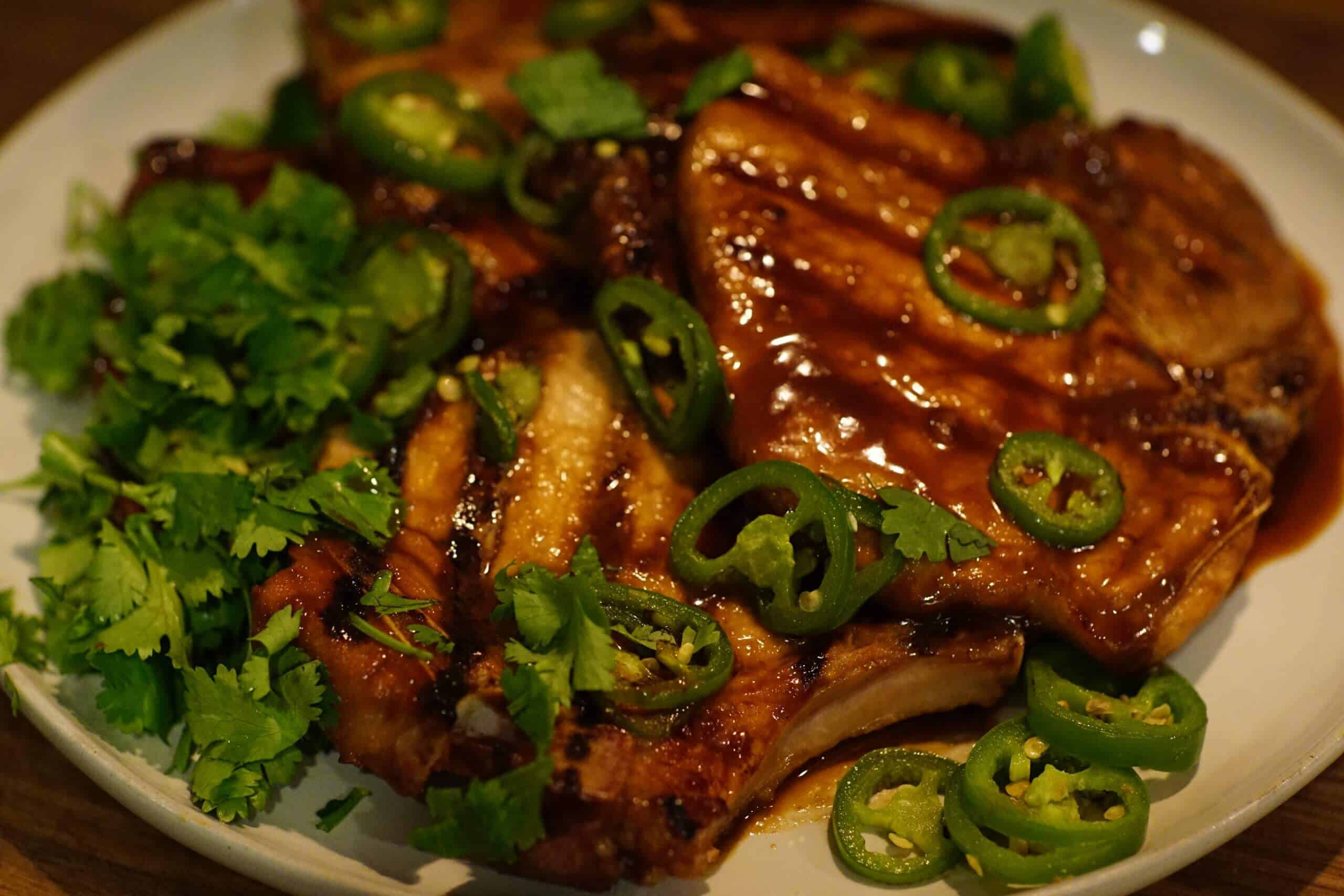 Top pork chops with herbs and jalapeños before serving.